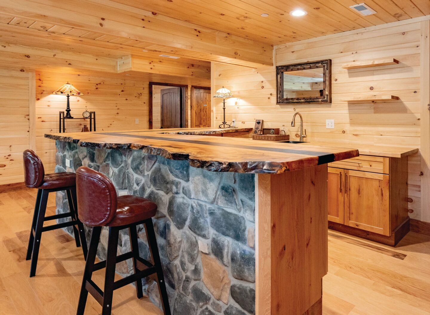 To make life easier for John, a Marine veteran who uses a wheelchair, all the essentials for comfortable living are located on the main level. An elevator also connects the main level to the lower level, where a bar area is outfitted with a handcrafted live-edge bar that Laura and John purchased from a “mom and pop” shop in West Virginia. An accessible ramp leads from the deck to the driveway.