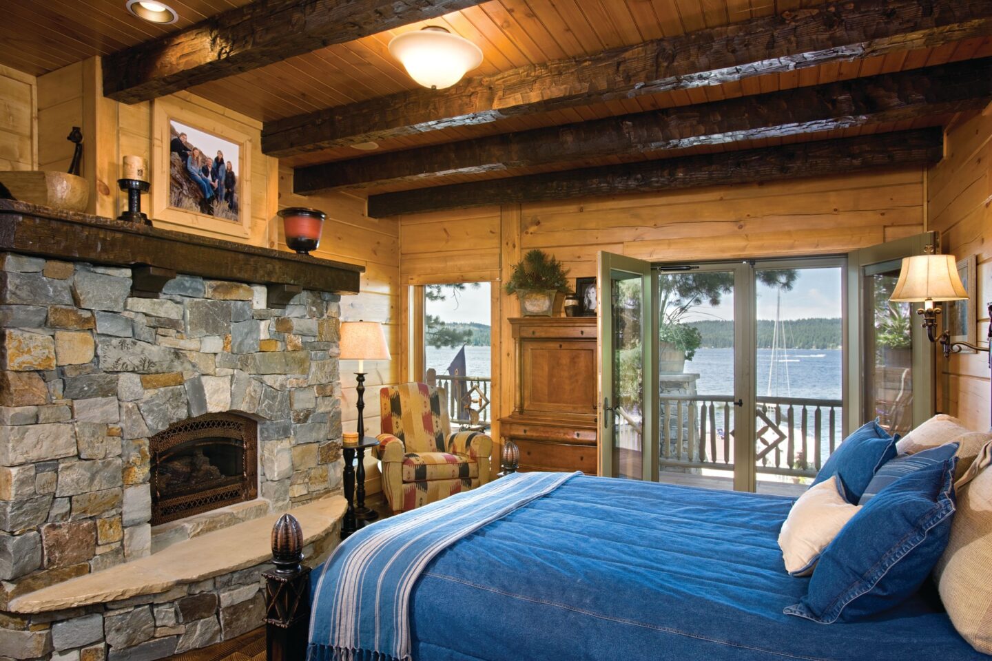 A primary bedroom with a view was the treasured space in a legacy home that caught the attention of Zachary Parmeter at Golden Eagle Log Homes. The client wanted to be able to gaze out at the stars at night and wake up to see the lake every morning.